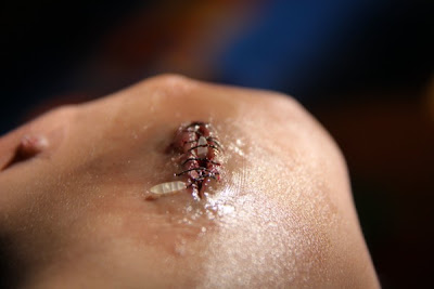 10. The take your fake blood. Apply only a tiny amount inside the wound. You can also add bloody "needle holes" where the stiches are. I think that an actual needle is the best way to apply blood: